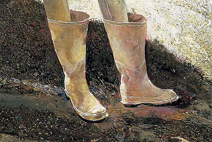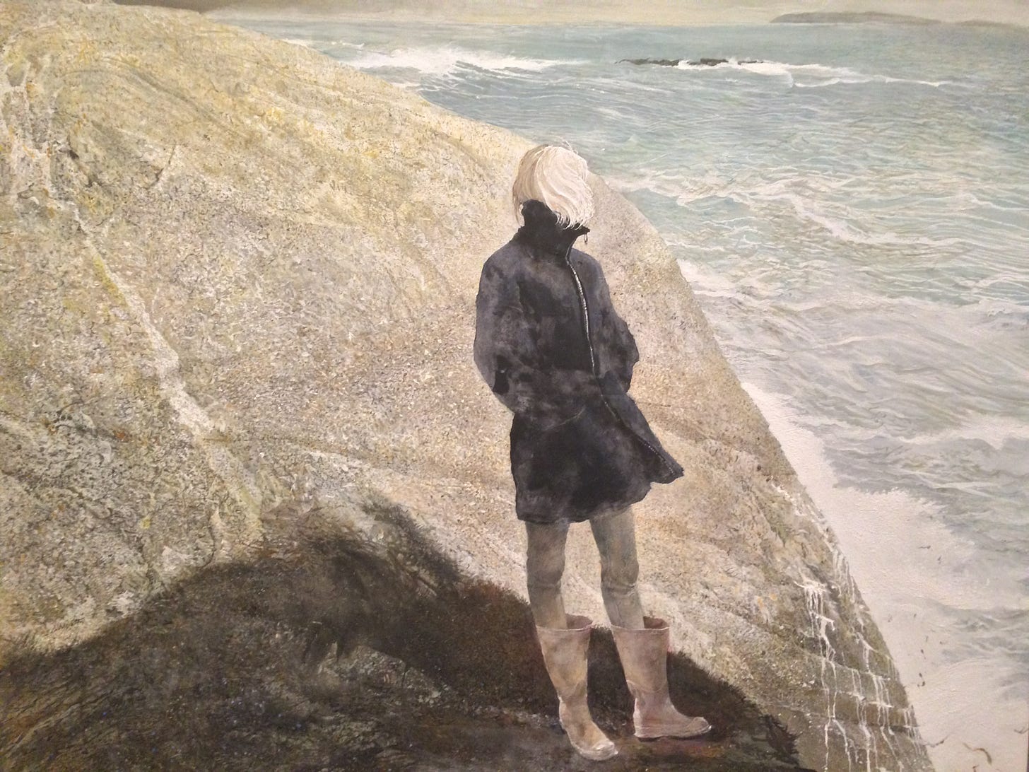 Egg tempera is not very widely used today. A notable example is Andrew Wyeth, a great watercolourist who also created moody and wonderfully textured tempera visions like this one. But he’s dead, so… I donno. Do people still use egg tempera? Have you ever tried it?